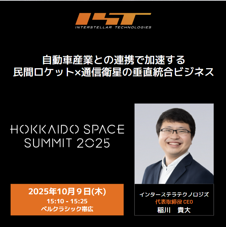 2025年10月9日に開催される宇宙ビジネスカンファレンス「北海道宇宙サミット2025」にて、代表取締役CEOの稲川が登壇します。当日は、「自動車産業との連携で加速する民間ロケット×通信衛星の垂直統合ビジネス」をテーマに語ります。